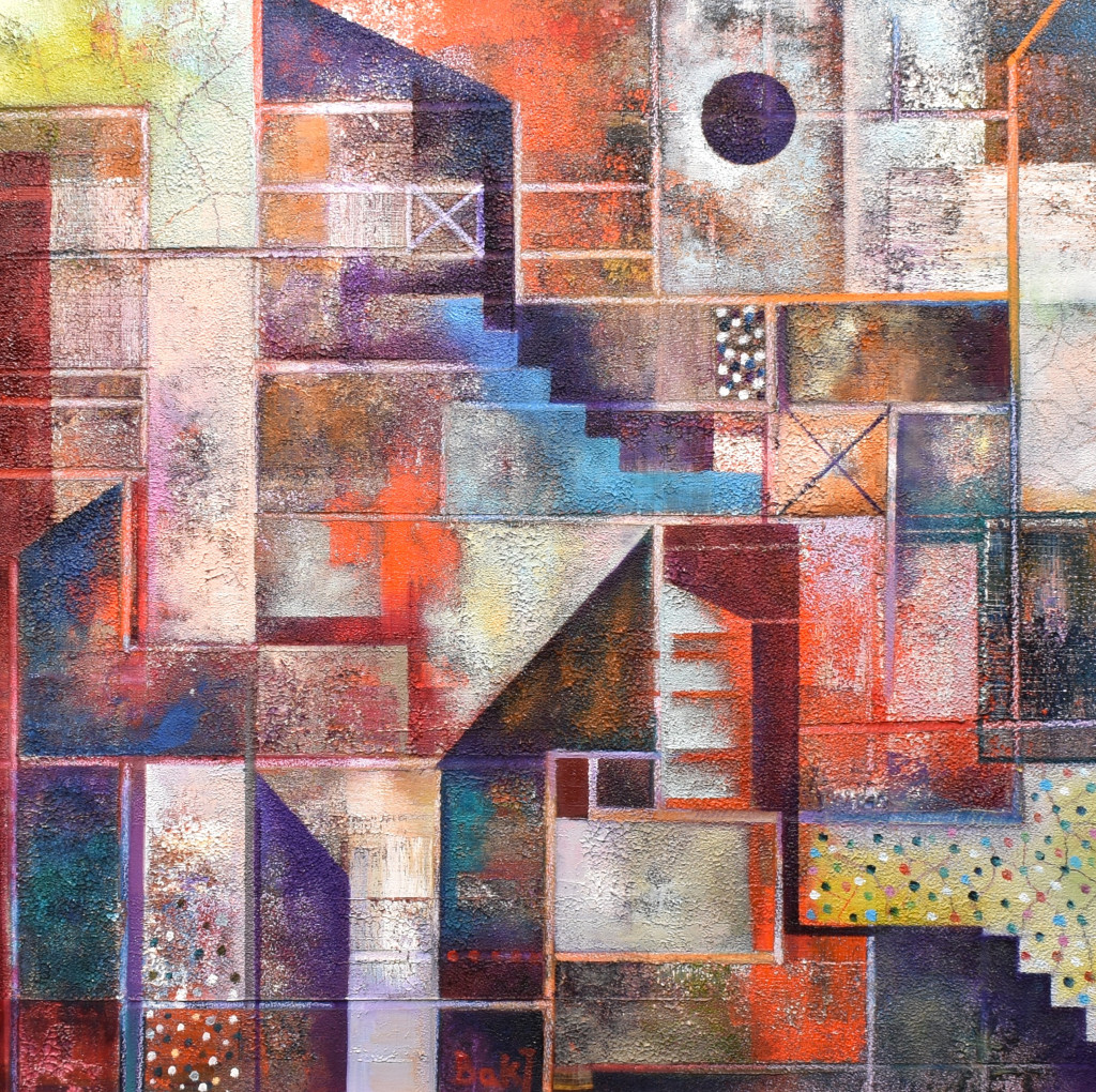 Bak Judit - Hajnalodik a lélekházak felett (No.V.) (50 x 50 cm) olaj/fa